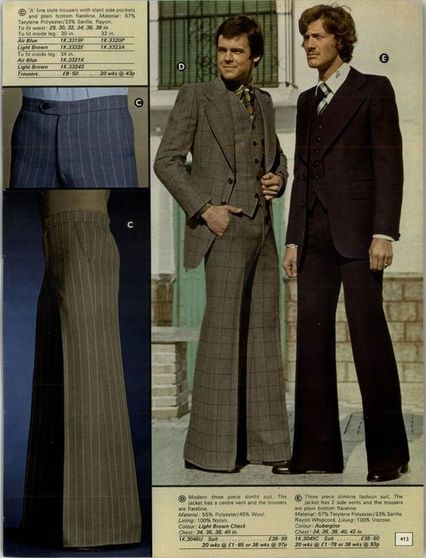 L’autorisation du port de pantalons pour les femmes depuis 1968 marque un tournant important dans le style “bureau chic” arboré par la gent féminine. Le pantalon 70s se veut taille haute et près du corps mais évasé aux chevilles. C’est la naissance du fameux "patte d’eph" qui s’associe à une veste de costume serrée près du corps aussi bien pour les femmes que pour les hommes. La jupe reste encore bien présente mais laisse à présent apparaître les genoux.